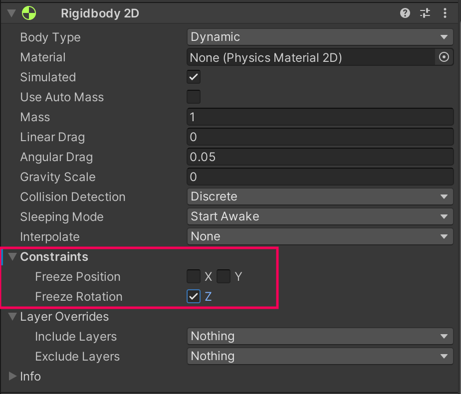 4. Enable the Freeze Rotation property to stop the Rigidbody2D component applying rotation forces to the PlayerCharacter GameObject.