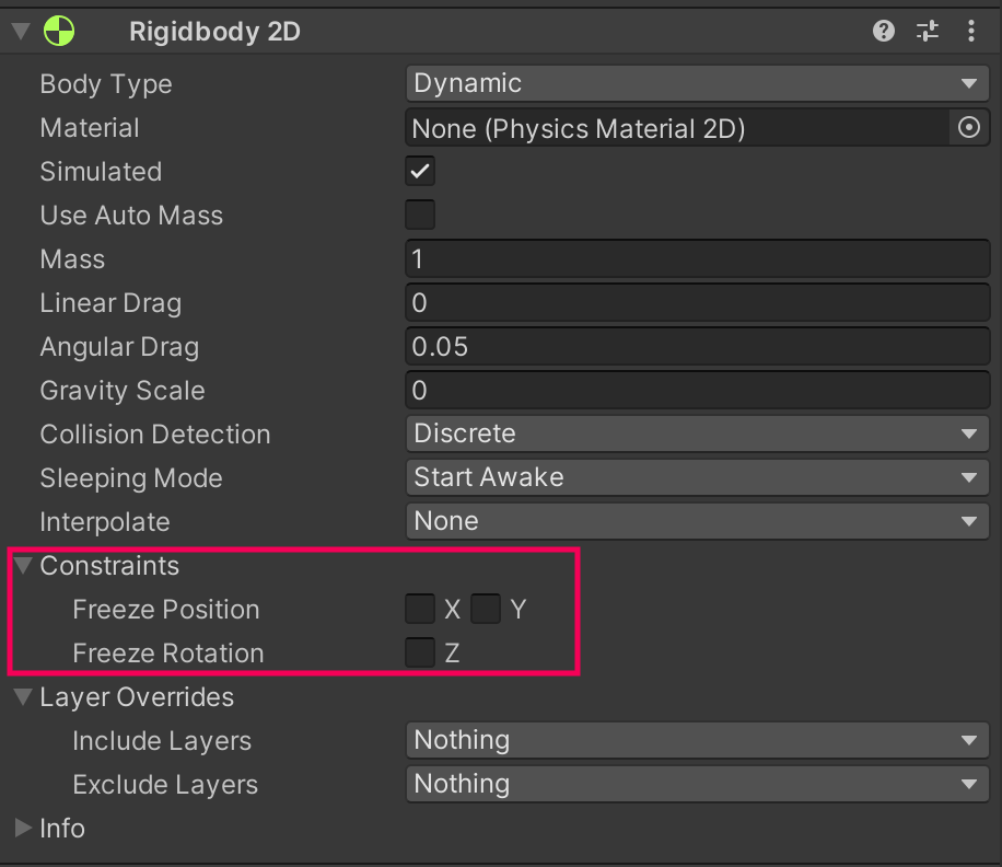 2. In the Inspector window, locate the Rigidbody 2D component.
