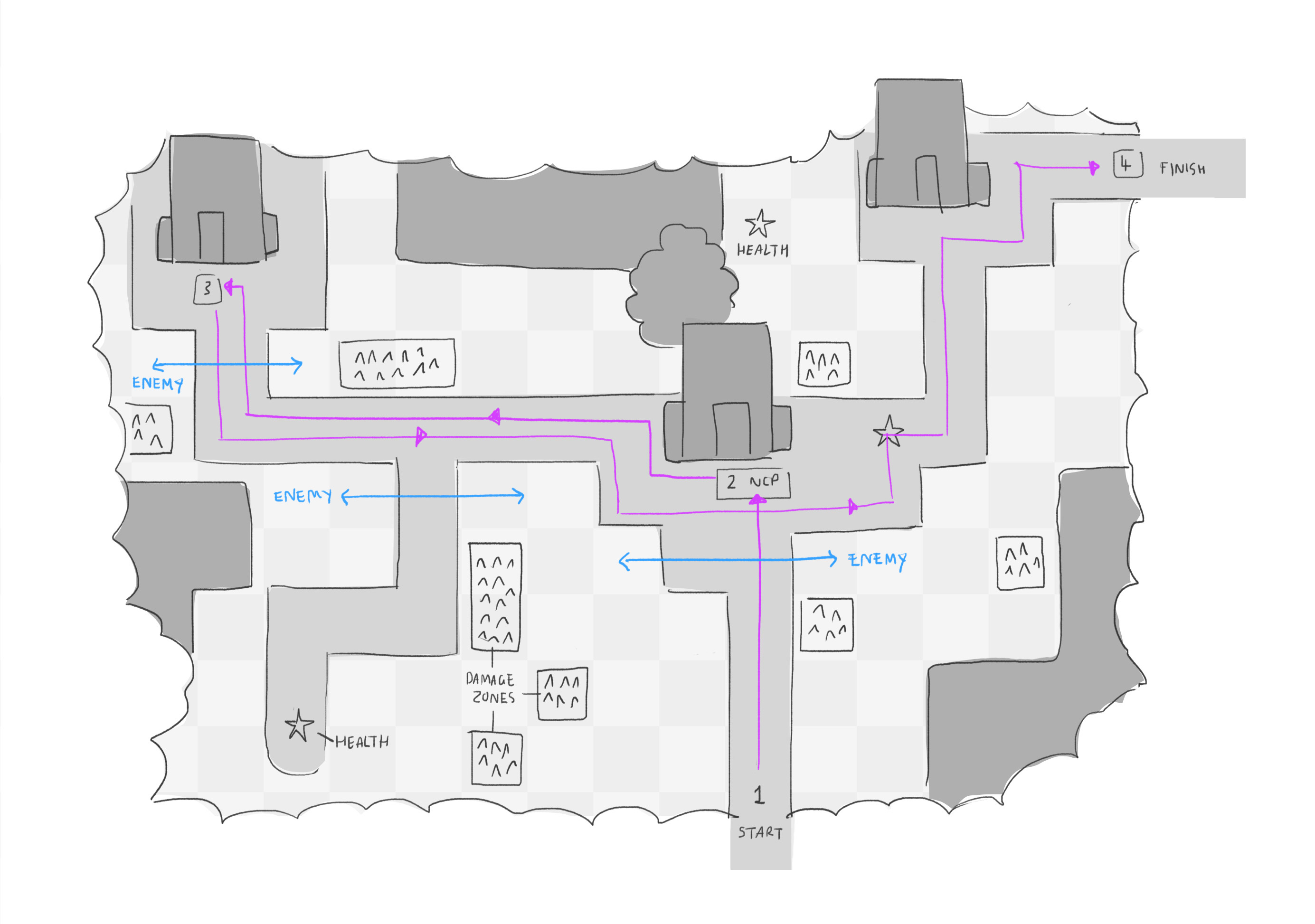 In your game, there will be two elements that can damage the player character: the static damage zones you’ve already put in place, and patrolling enemy characters. Think about how you can arrange your environment and decorations so that the player has to engage with these obstacles before they can reach certain parts of the level.