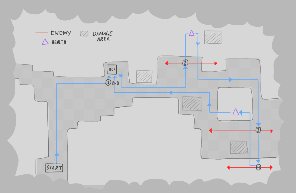 - Obstacle placement: Can the player avoid some of the obstacles in the scene (damage zones and moving enemies)? If so, why? And what are the consequences of this?