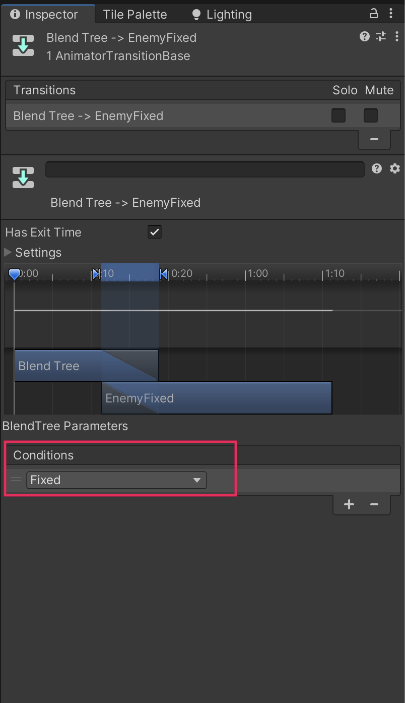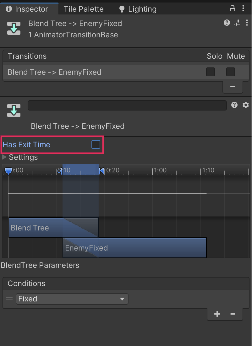 5. Select the transition between the Blend Tree node and the EnemyFixed node, then go to the Conditions list in the Inspector window. Select Add (+) and set the new Fixed parameter as the condition.