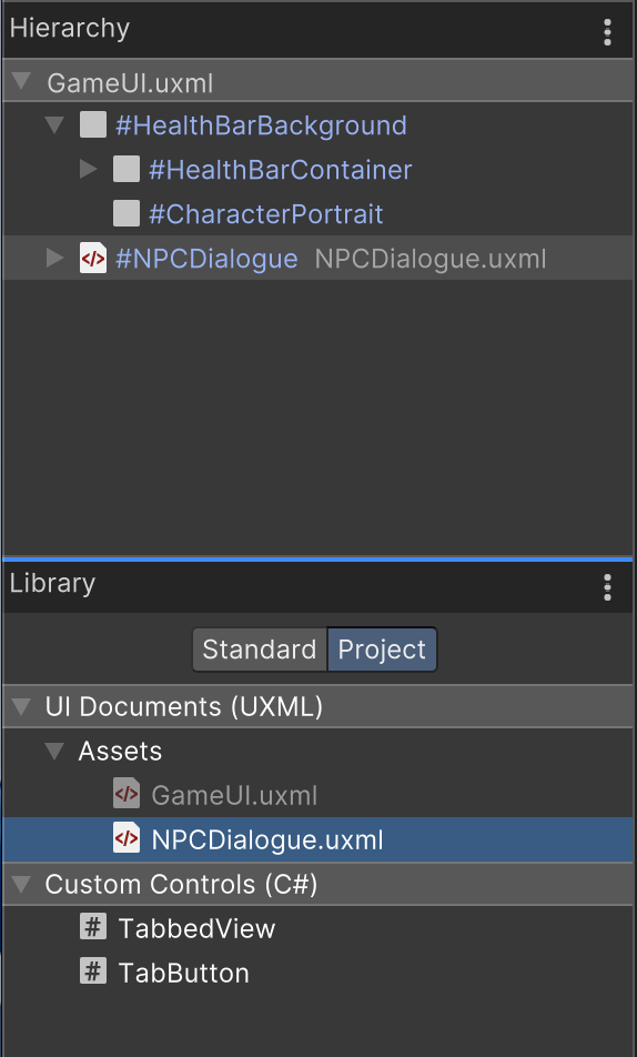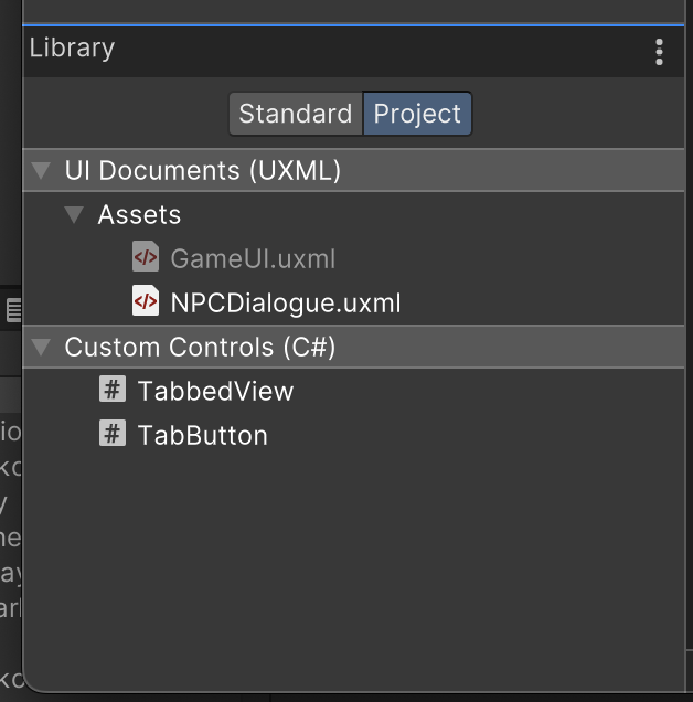 2. In the Library window, select the Project tab. Use the foldout (triangle) to expand the Assets foldout. You’ll find the two UI Document assets that you’ve created listed.