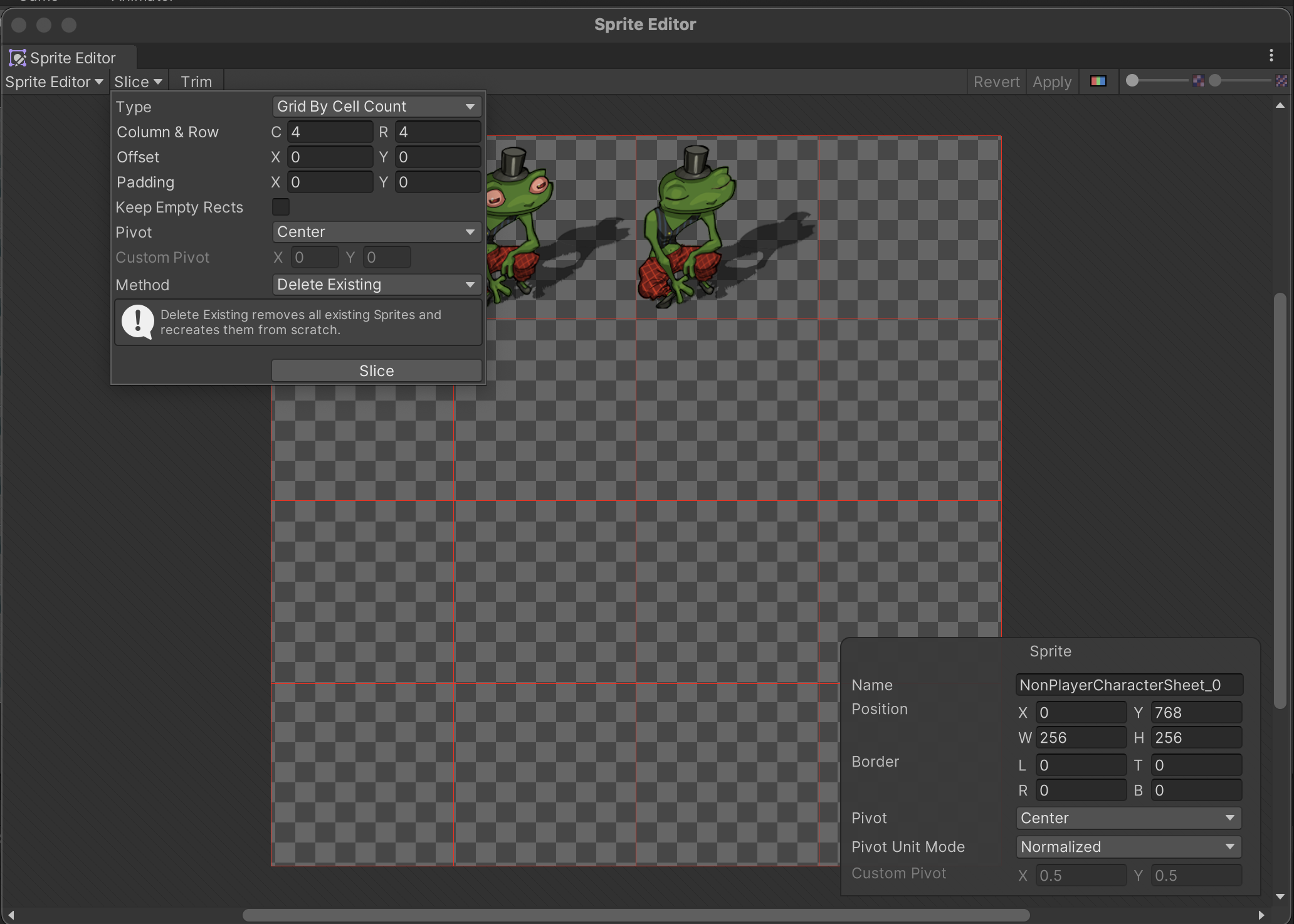 2. From the Inspector window, open the Sprite Editor window and slice the sprite atlas in a 4 by 4 grid.