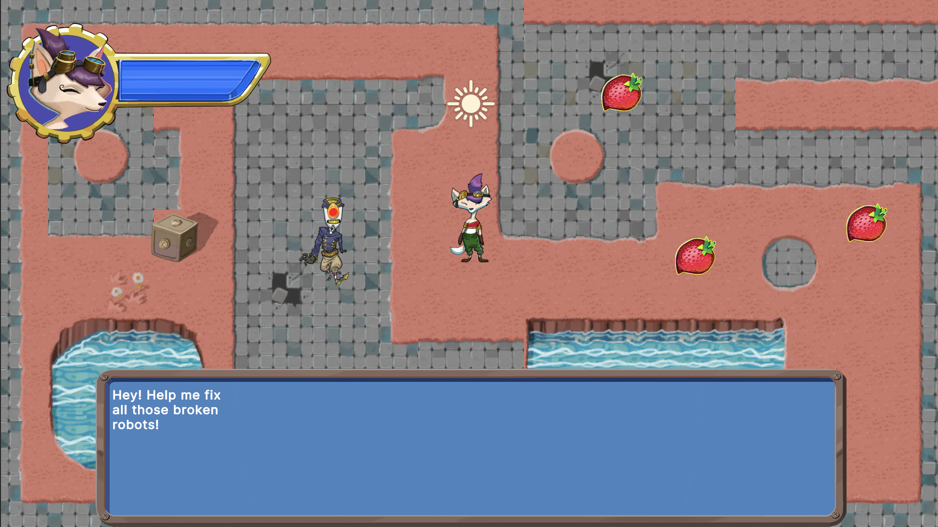 The NPC is going to tell the player that they need to fix the robot enemies, but if that text is constantly displayed on screen that’s going to take up space that could be better used. The NPC’s dialogue should only display when the player character is within a certain range, so you need to determine when the player character is close and facing the NPC.
