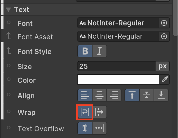 9. In the Inspector window, use the foldout (triangle) to expand the Text section. Set the Font, Size, and Color properties as you like.