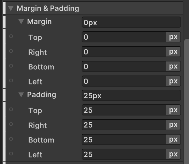8. In the Inspector window, use the foldout (triangle) to expand the Margin & Padding section. In the Margin box enter “0” and in the Padding box enter “25px”, to set the same value for all sides.