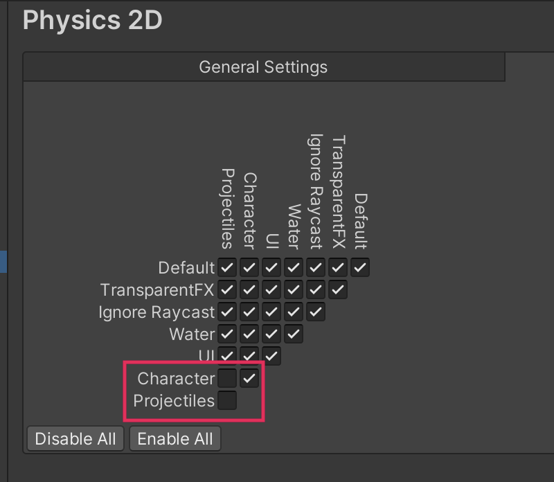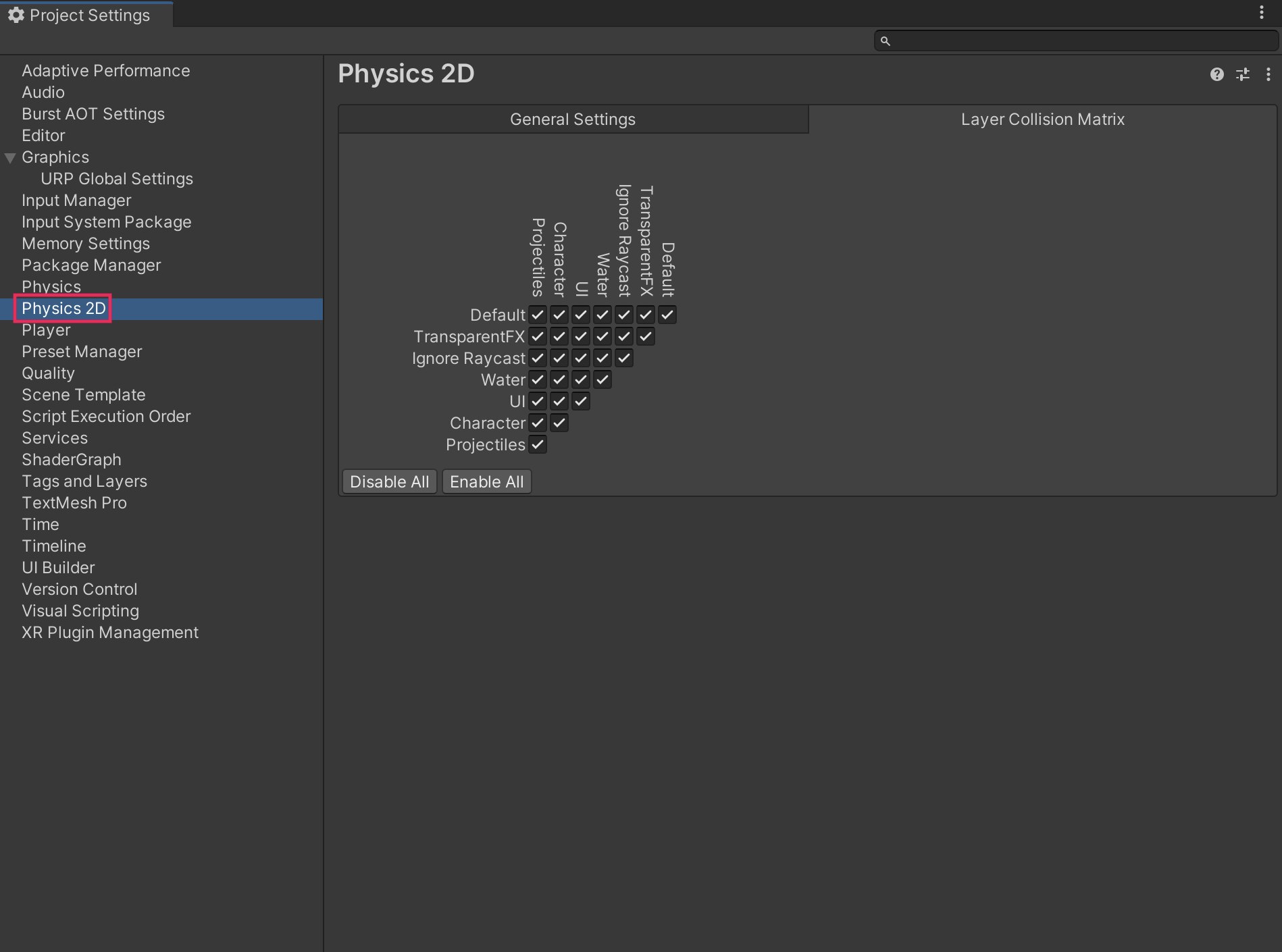 1. In the main menu, go to Edit > Project Settings… > Physics 2D. Select the Layer Collision Matrix tab.