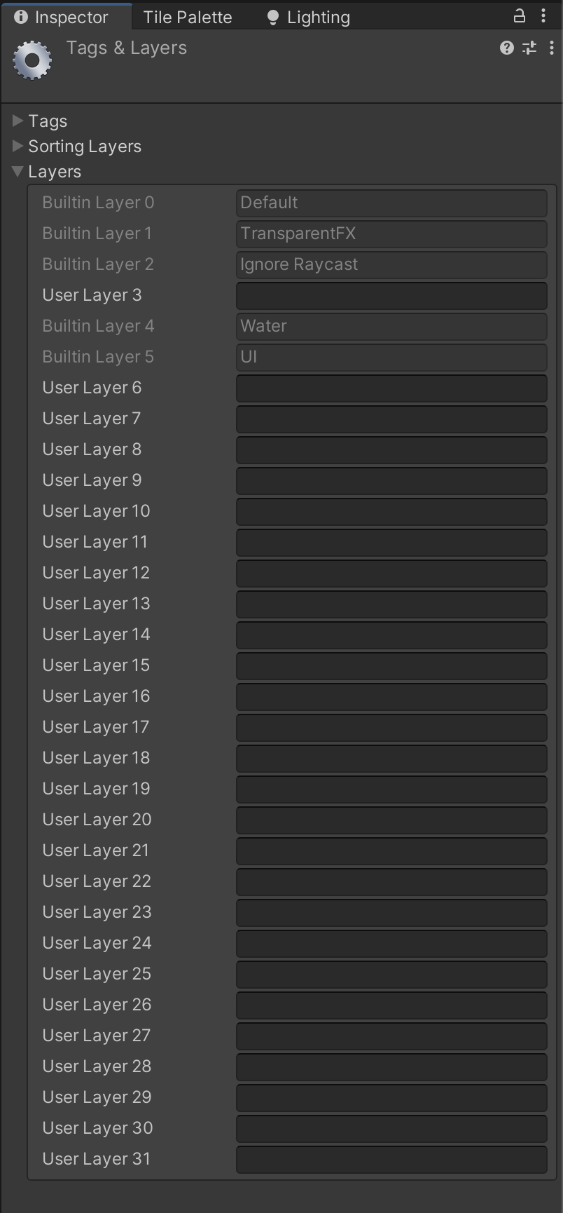 Note: Some layers are used by Unity for fixed purposes, but you can use the other layers as needed.