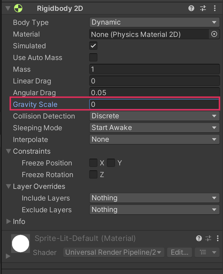 5. In the Rigidbody 2D component, set the Gravity Scale property to 0.