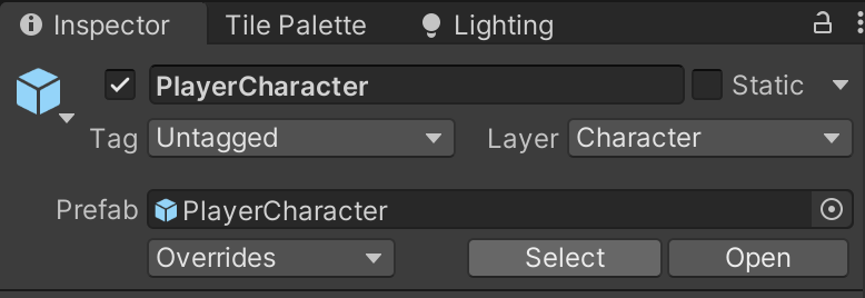 5. Select the PlayerCharacter GameObject again. Set its Layer property to Character, then save your changes and exit prefab editing mode.