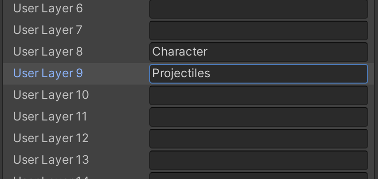 4. Pick any two empty layers and call them “Character”, and “Projectiles”.