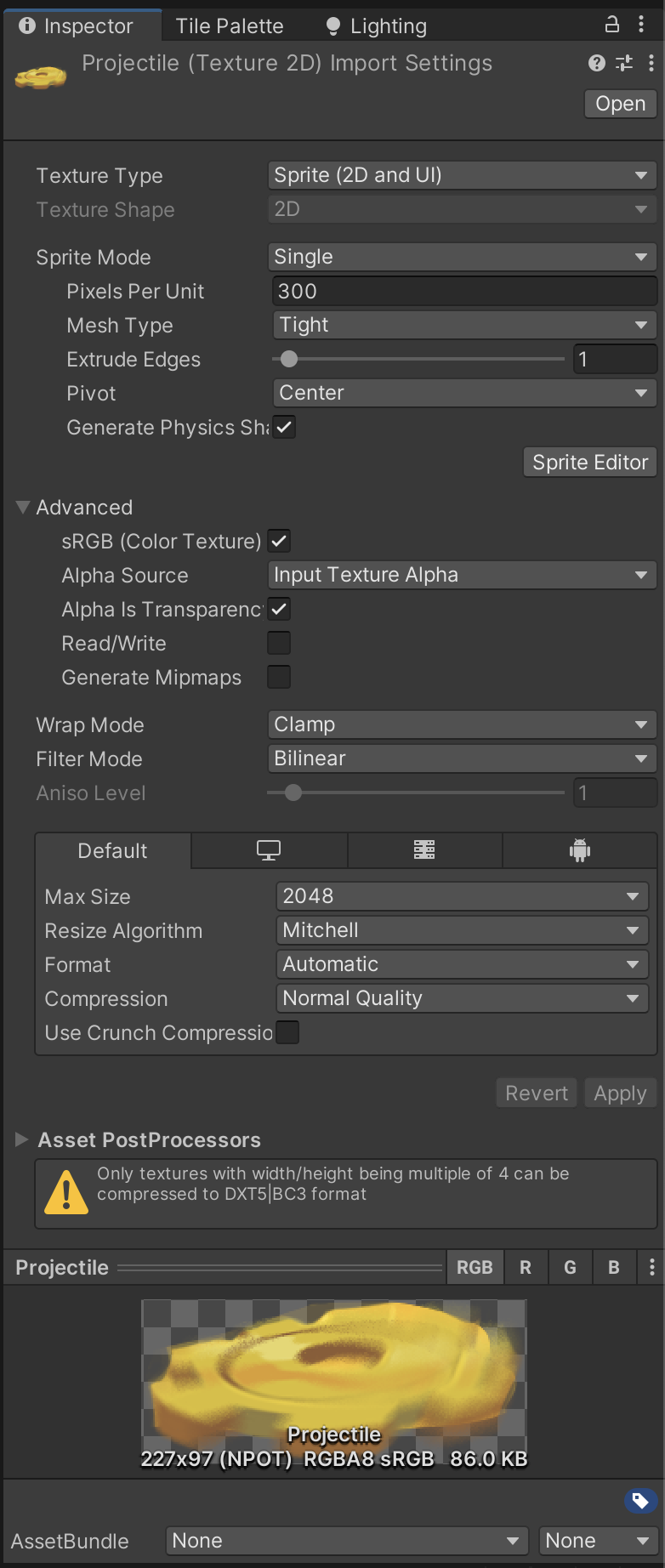 1. In the Project window, within your chosen asset pack folder, navigate to Art > [Chosen Asset Pack] > VFX Select the Projectile sprite.