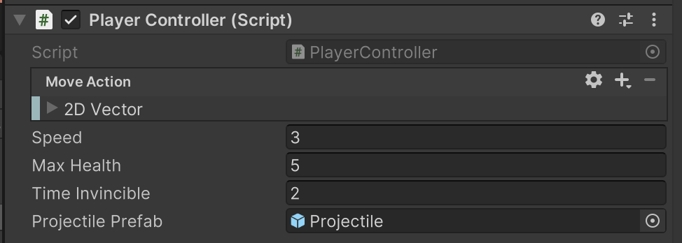 2. In the Inspector window, go to the Player Controller (Script) component. Find the new Projectile Prefab field and assign the Projectile prefab.
