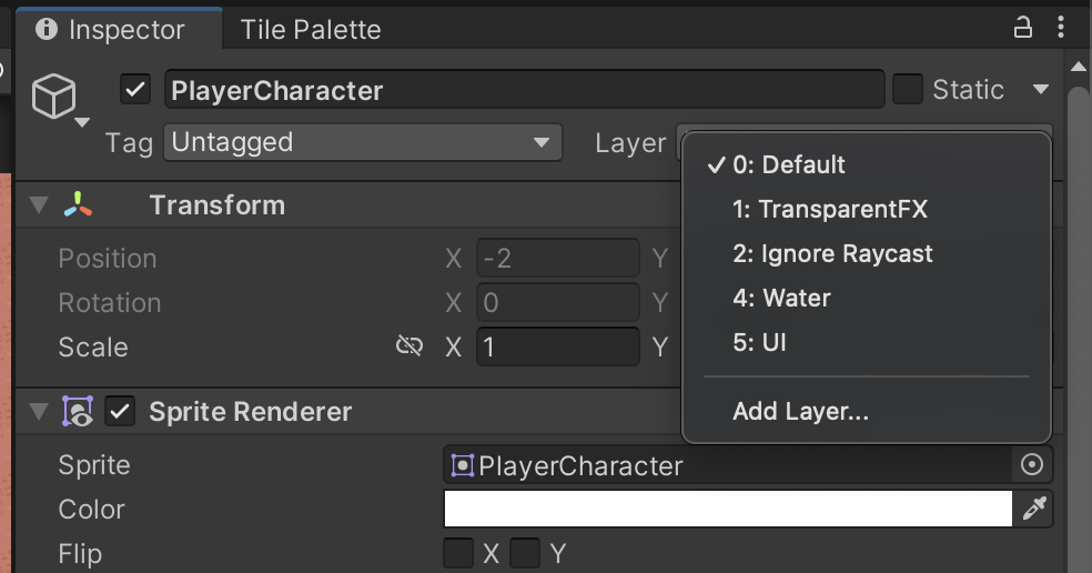 2. In the Inspector window, go to the GameObject header. Open the Layer property dropdown.
