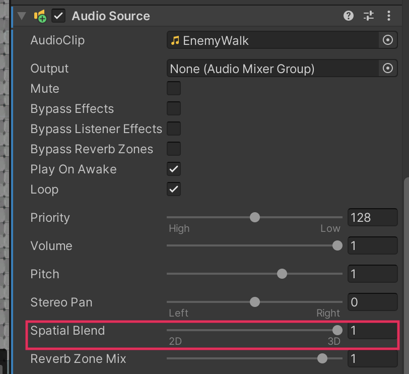4. Set Spatial Blend to 3D (the very end of the slider range).