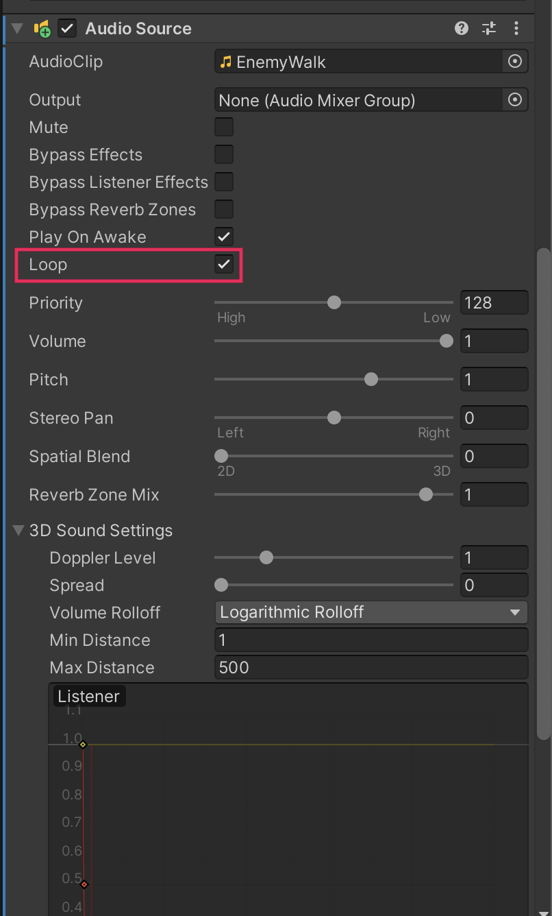 2. Assign the EnemyWalk asset to its Audio Clip field.