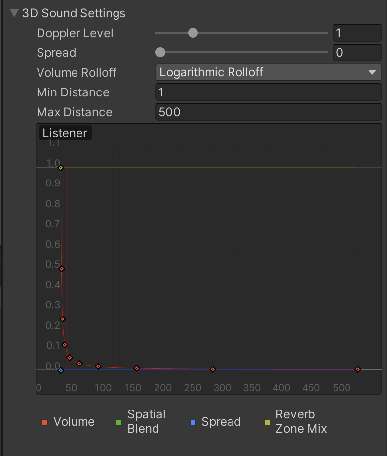 - Logarithmic Rolloff: The default, which mimics the way that sound behaves in the real world. A visualization of this audio reduction curve is currently displayed in the Listener preview pane.
