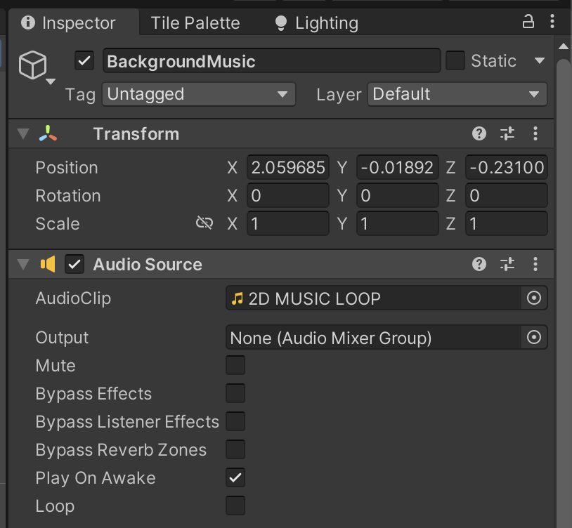7. Save your changes and test the game. The audio will start to play as soon as the game launches.