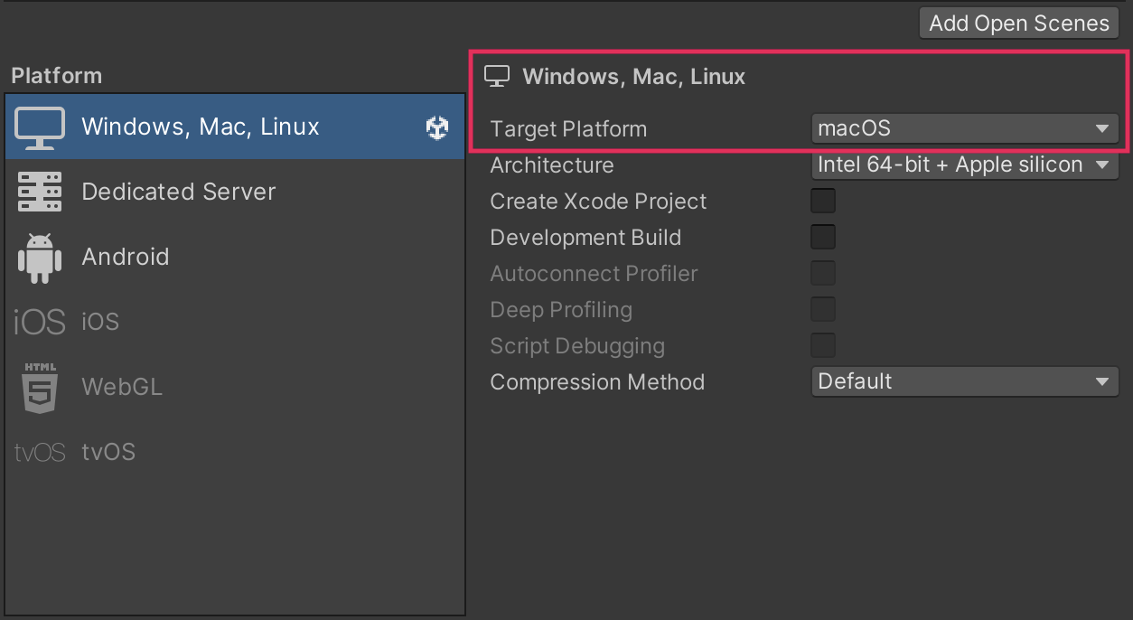 2. Below the Scenes in Build list, select Add Open Scenes. The scene that you have created your game in will be added to the list.