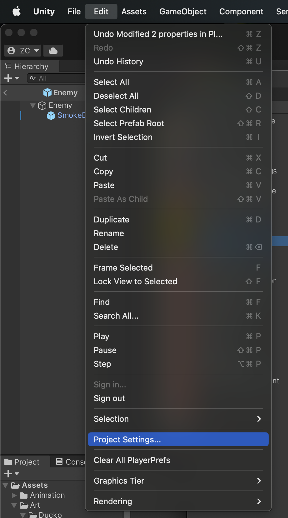 2. In the main menu, go to Edit > Project Settings…, then select Player.