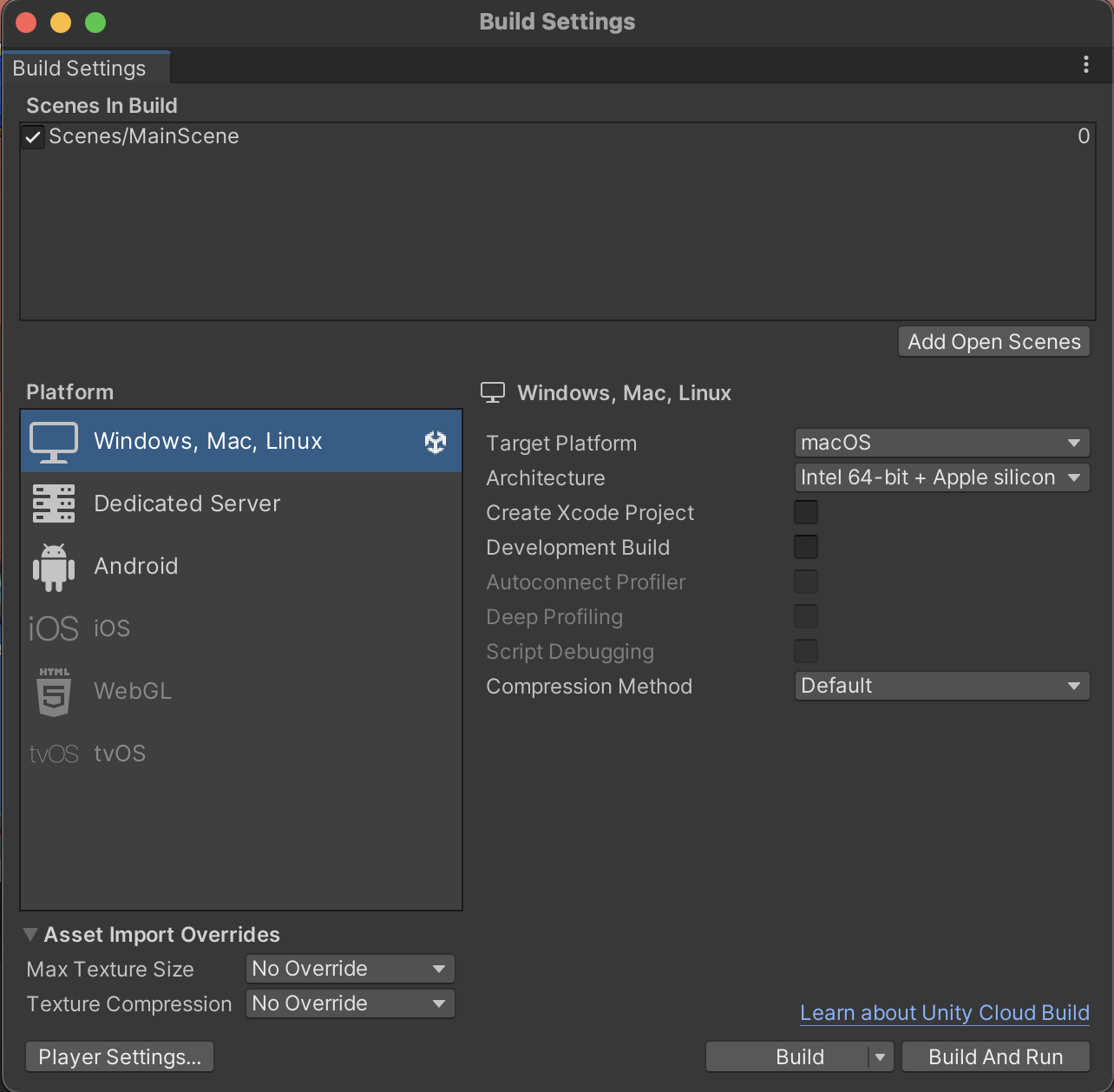 Note: If you are working with your own project you may have multiple scenes that you want to include in the build. Make sure that they are all added here — you can drag scene assets from the Project window and release them over the Scenes in Build list.