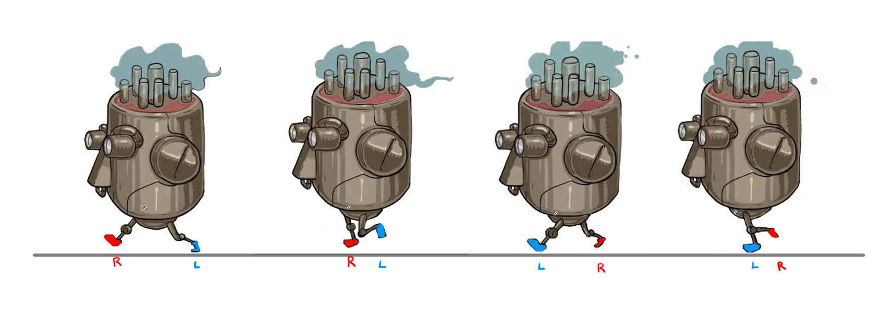 - Passing pose: The character’s weight is now on the front foot (2), and the back foot (1) is moving forward and crossing (passing) the front leg. The cycle will restart from the forward contact pose.