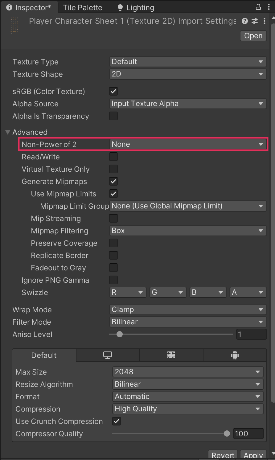 7. If you are using an asset that hasn’t been saved at a power of two size, use the foldout (triangle) to expand the Advanced setting. Open the Non-Power of 2 property dropdown and select ToNearest to scale the sprite size to the closest power or two.