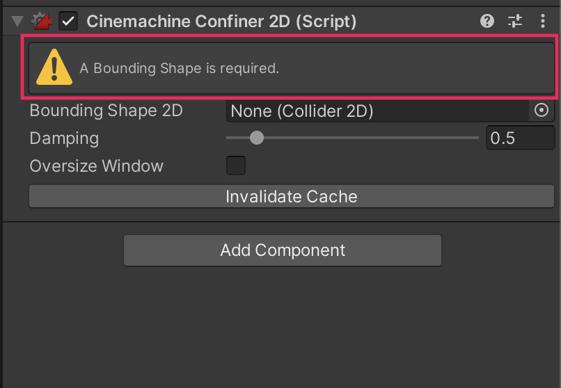 3. Select the Add Extension property dropdown and select CinemachineConfiner2D. The newly added Cinemachine Confiner component will display a warning that a Bounding Shape is required.