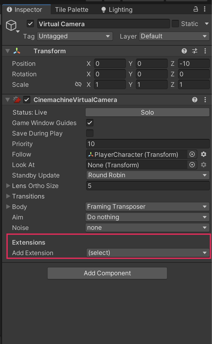 2. In the Inspector window, go to the CinemachineVirtualCamera component and find the Extensions section.