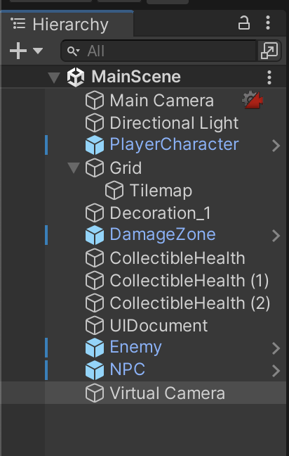 The camera will now seem further away than it previously did when you were testing the game, and you’ll be able to view more of the gameplay environment. If your initial environment was small, the blue background will be visible too. This change is because the Main Camera GameObject is now using the Virtual Camera GameObject’s default settings, which are slightly different.