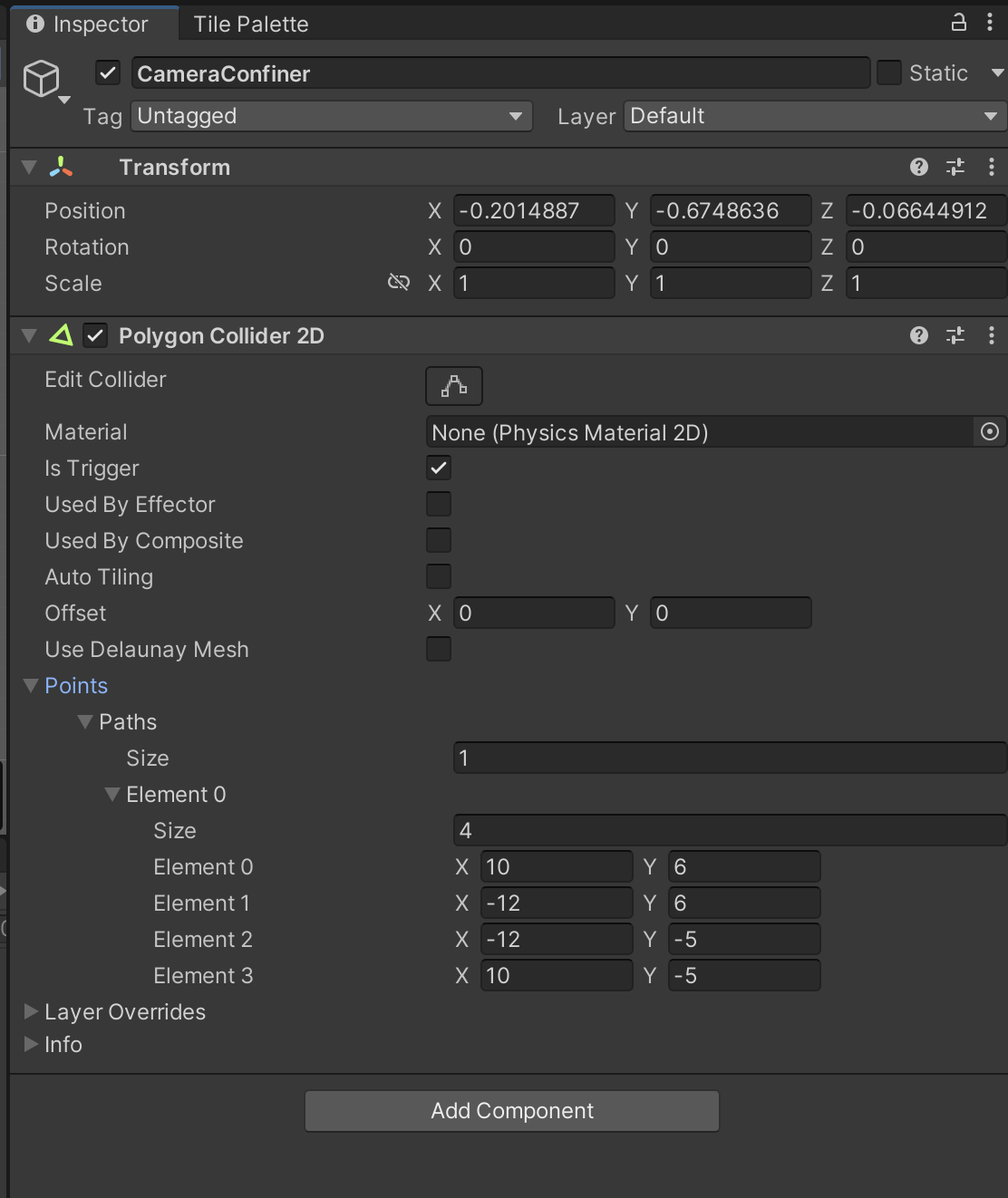 5. In the Inspector window, add a Polygon Collider 2D component to the CameraConfiner GameObject.