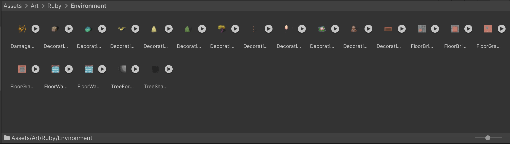 1. In the Project window, in the folder for your chosen asset pack, navigate to Assets > Art > [Your Chosen Project] > Environment. All of the files in this folder with names that start with “Floor” are tilesets.