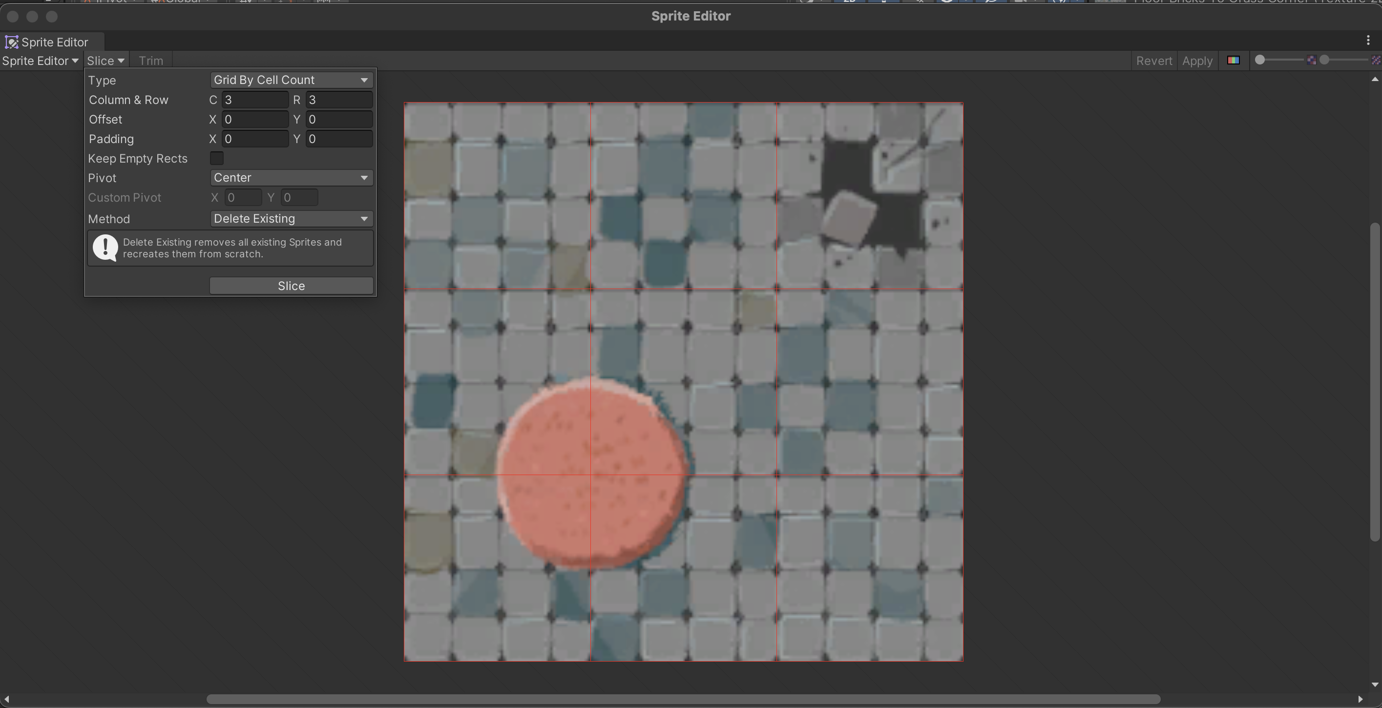 5. Set the Column & Row property values (both C and R) to 3. A red grid will be overlaid on the image as a preview of the sprites that will be created when you slice the file.