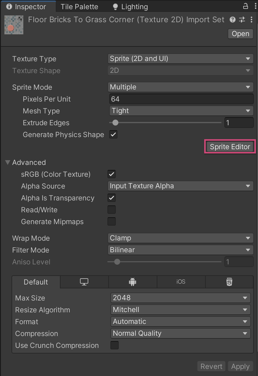 Now that you’ve changed the import settings, you can split the asset into the different individual sprites that you’ll use to create the game tilemap.