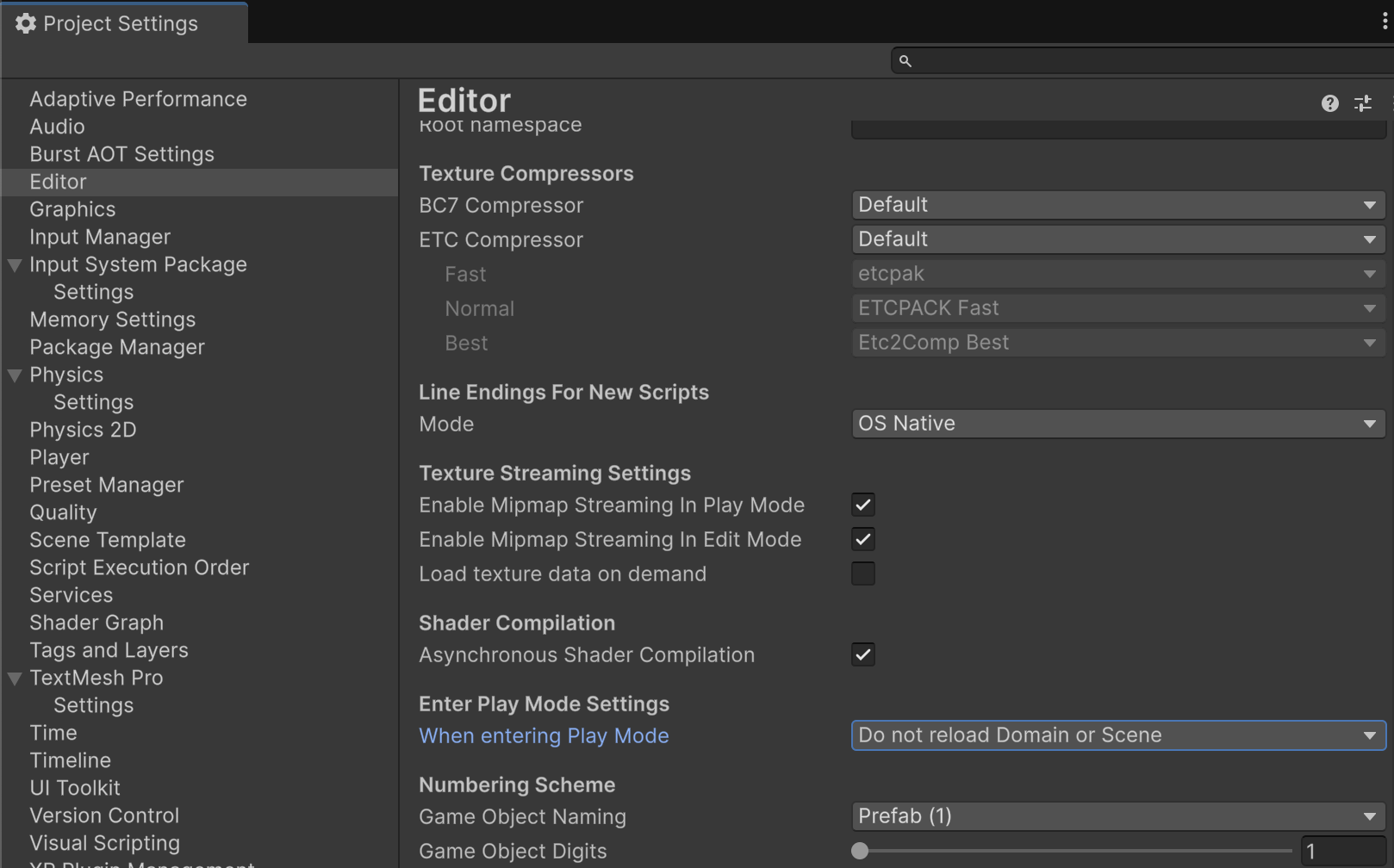 - Under Enter Play Mode Settings, set the When entering Play mode property to Do not reload domain or Scene.