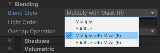 2. In the Light 2D component, use the foldout (triangle) to expand the Blending section and locate the Blend Style property.