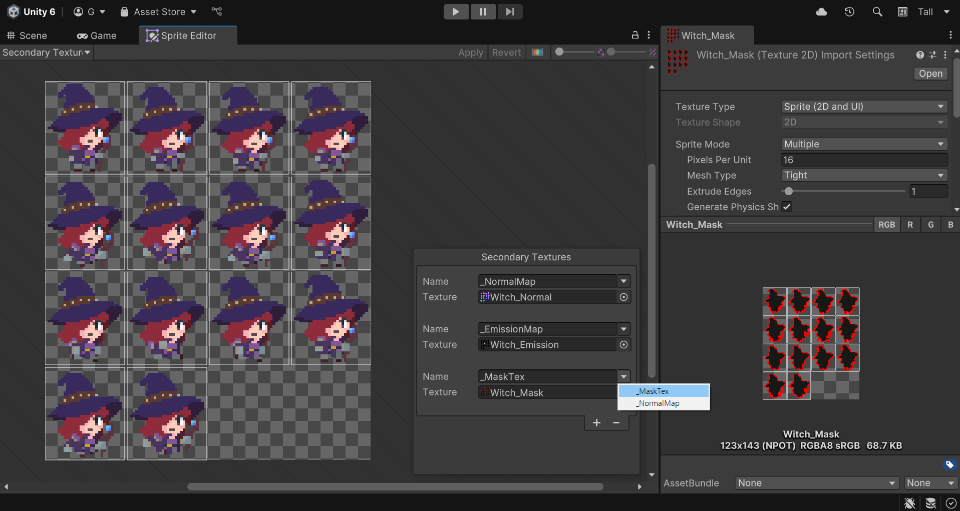 In the previous tutorials, when you opened the Witch sprite inside the Sprite Editor window and went to Secondary Textures, there was the option to add a _MaskTex category.
