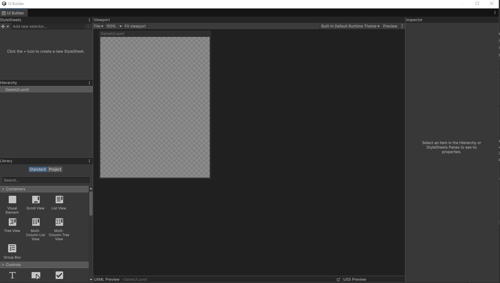 The upper-left panel contains the Hierarchy window of your UI, which at the moment only contains the GameUI.uxml file. Below the Hierarchy window there is the Library window that contains all kinds of UI controls you can add to your UI.