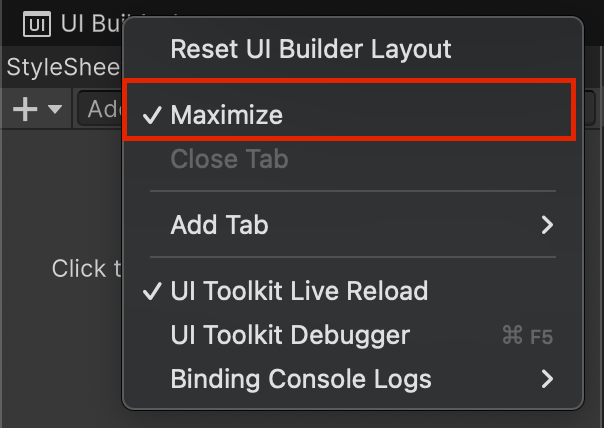 Tip: If you maximized the UI Builder window and can’t see the other windows, double click or right-click the UI Builder window name, and uncheck the maximize button to get back to your previous layout of the Editor.