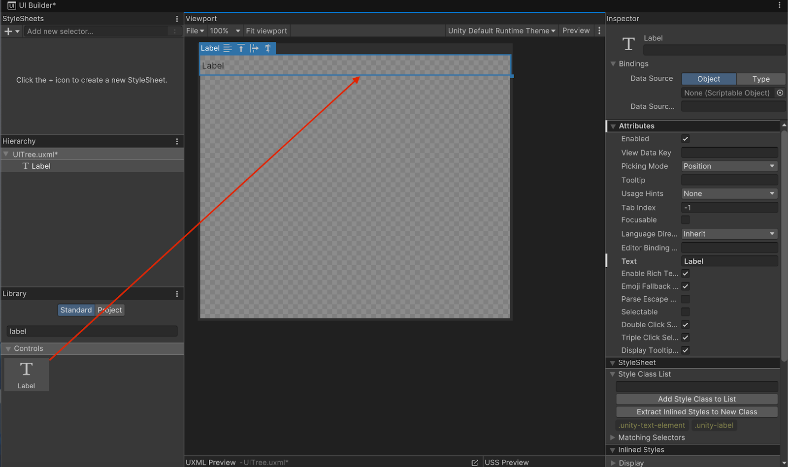 6. In the Library window, under the Controls section, drag and drop the Label element into the Viewport window.