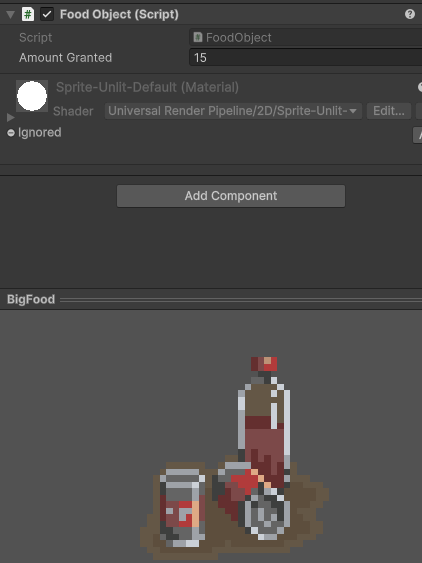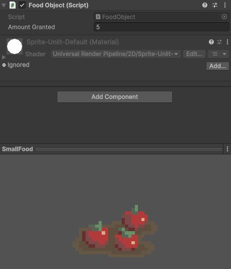 7. Add a FoodObject component, then save and exit prefab editing mode.