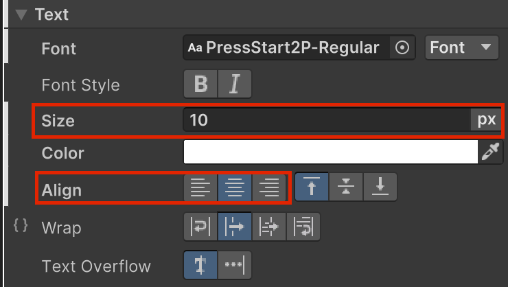 9. Select the Font property picker (⊙) and assign either the provided PressStart2P-Regular font or your own.