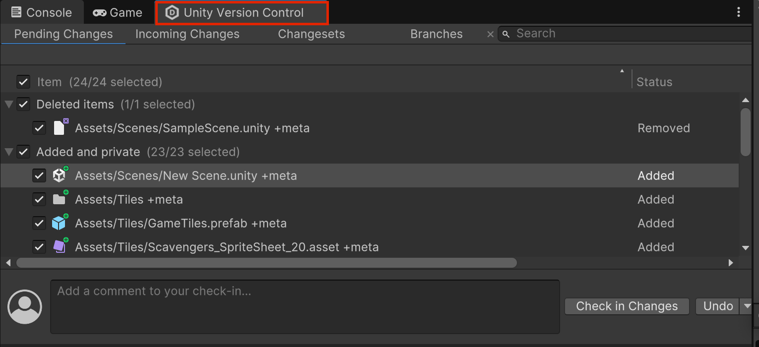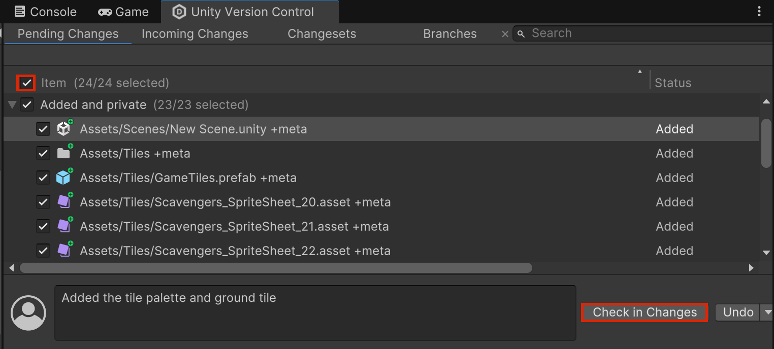 3. Make sure all files are selected, enter a check in message (something like “Added the tile palette and ground tiles”) and select Check in changes.