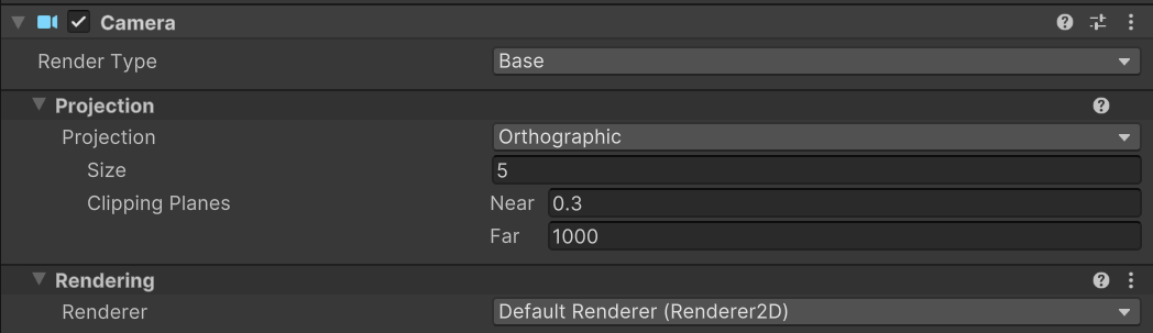3. Double click Main scene to open it. In the Hierarchy window, select the Main Camera GameObject, then in the Inspector window, under the Camera section, ensure that the Projection property is set to Orthographic and the Size property is set to 5.