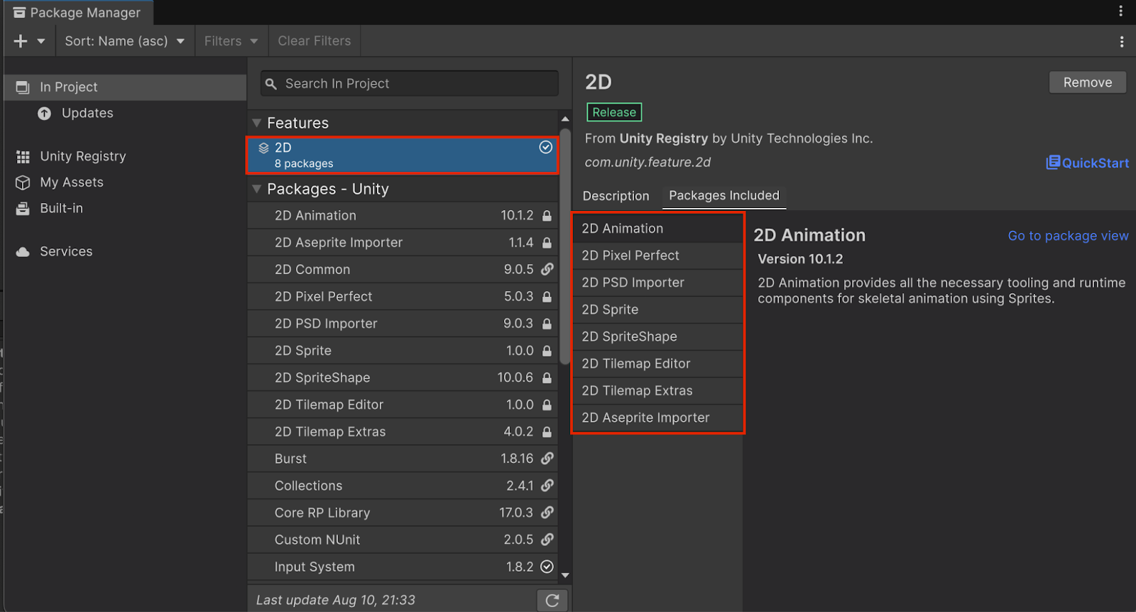 First, you need to verify that you have all the packages you need. Because you created this project using the 2D URP template, all the necessary packages should already be all installed. To make sure, open the Package Manager (Window > Package Manager), select the In Project tab, and check that all the packages for the 2D features are installed. If that’s not the case, select the Unity Registry tab, enter “2D” in the Search Unity Registry box, select the 2D package, and select Install in the upper-right corner.