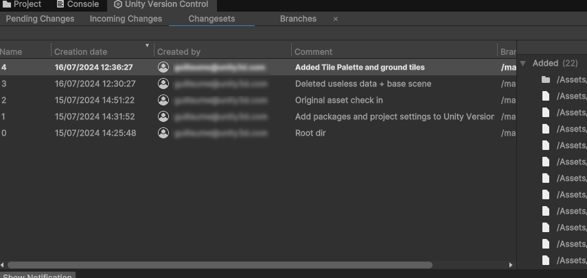 Note: Some of those early check-ins were made automatically by the Unity Version Control system.