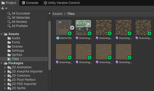 If you take a look into your Project window, the Tiles folder and the new tiles in it should now display a small green plus sign (+) next to them.