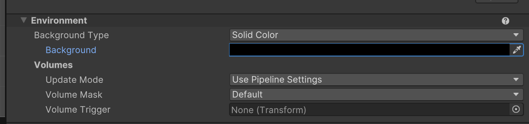 4. Under the Environment section of the Camera settings, ensure the Background Type property is set to Solid Color and set the Background Color property to black (000000).