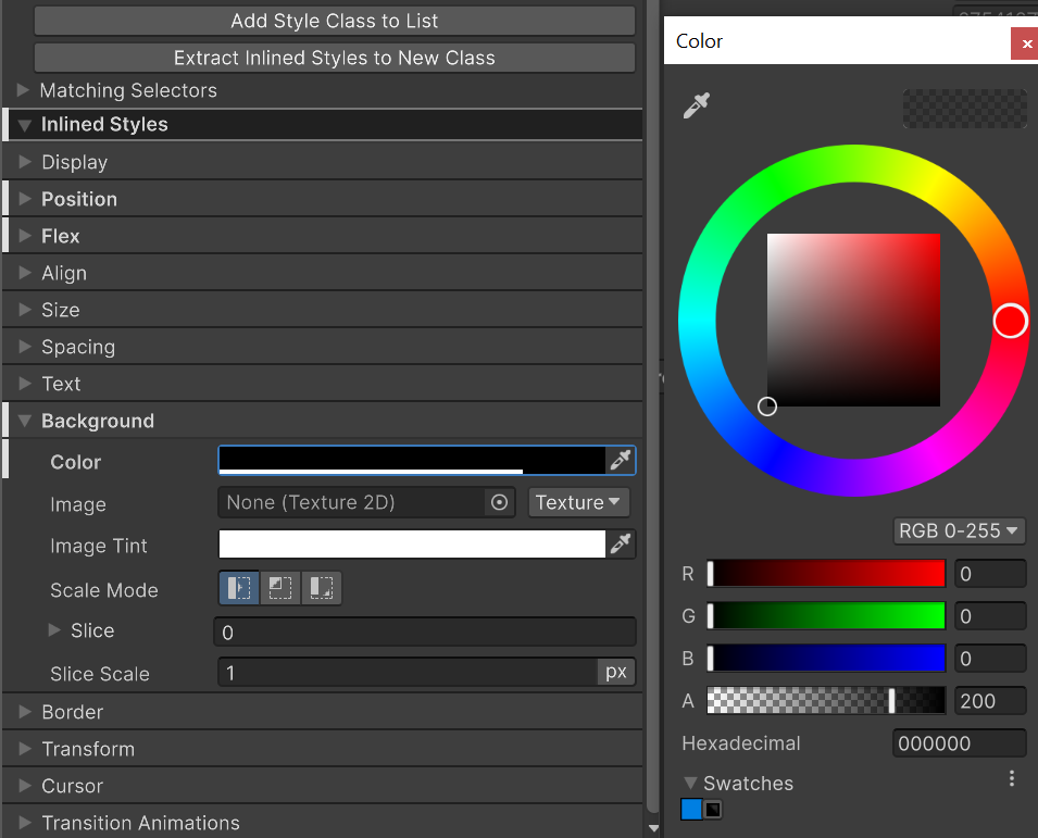 4. Use the foldout (triangle) to expand the Background section and set the Color to black (000000) but with an alpha (A) value of ~200.