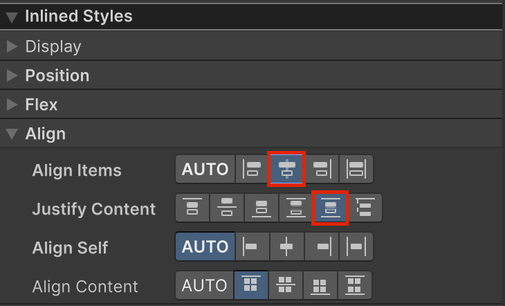 7. Select the GameOverPanel GameObject and use the foldout (triangle) to expand the Inlined Styles section, then the Align section in the Inspector window. Set the Align Items property to center and the Justify Content property to space-around.